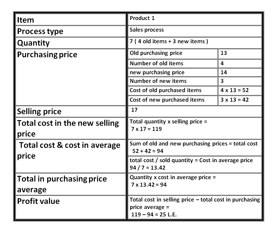To make it easy for you to understand, let’s assume the existence of an item called (product 1) which we buy a quantity of (6 pieces) of it with a purchasing price (13 L.E) and a selling price (17 L.E), then we sell 2 pieces of this product which both have the purchasing price (26 L.E) and a selling price (34 L.E) and consequently we have now 4 pieces out of 6 pieces.